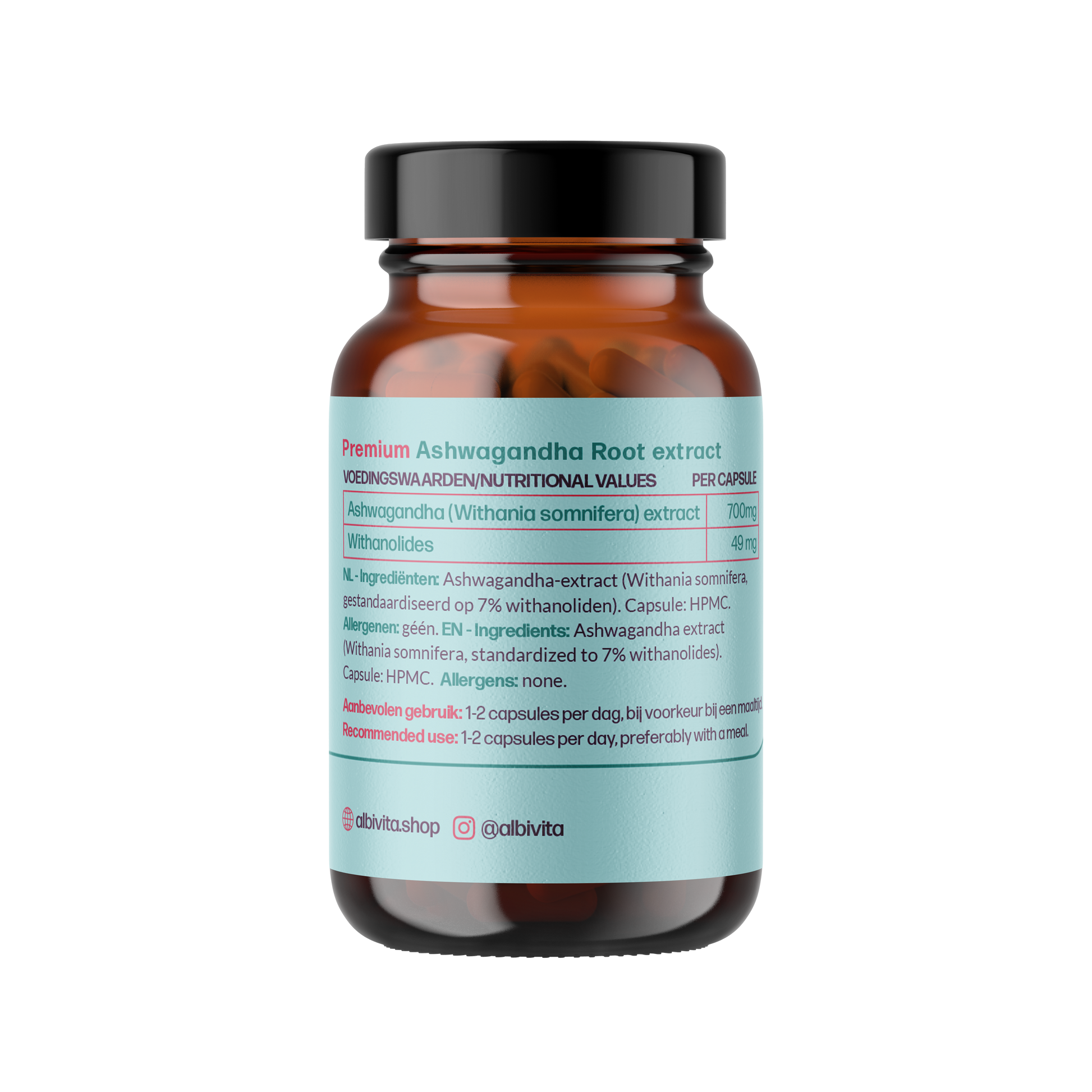Ashwagandha-wortel poederextract (7% withanoliden) – 700 mg. Capsule: hydroxypropylmethylcellulose (plantaardig).